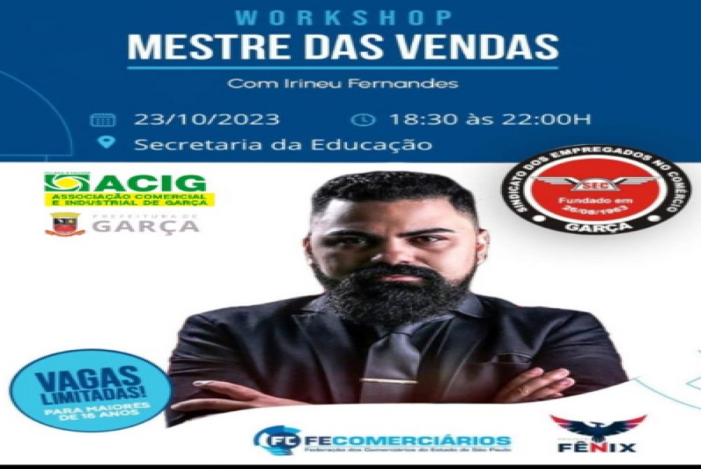 Empreendedores, vendedores e profissionais do comércio de Garça e região têm um encontro marcado com o sucesso nesta quinta-feira, 23 de outubro. O Sindicato do Comércio, com o apoio da ACIG – Associação Comercial e Industrial de Garça e da Prefeitura Municipal, promove o workshop "O Mestre das Vendas", comandado por ninguém menos que Irineu Fernandes, uma das maiores referências nacionais em estratégias de vendas e desenvolvimento comercial.