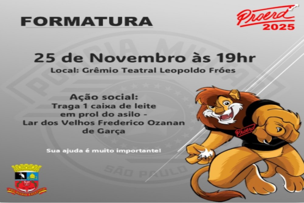 A Prefeitura de Garça informa que, durante a formatura do PROERD, que será realizada no dia 25 de novembro, às 19h, no Grêmio Teatral Leopoldo Fróes, acontecerá uma campanha especial de arrecadação em prol do Lar dos Velhos Frederico Ozanam.