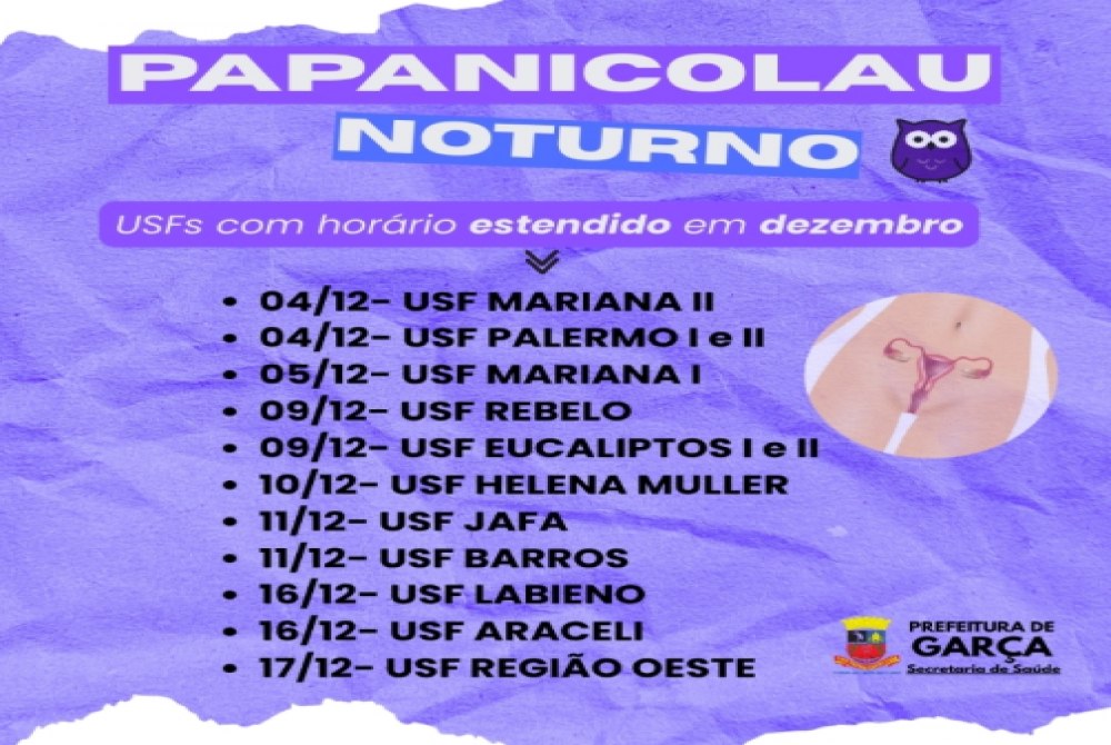 A Prefeitura de Garça, por meio da Secretaria Municipal de Saúde, reforça seu compromisso com a promoção da saúde e a prevenção de doenças. Durante o mês de dezembro, as Unidades de Saúde da Família (USF´s) estarão abertas em horário estendido, das 17h às 20h, para a realização do exame preventivo de Papanicolau.