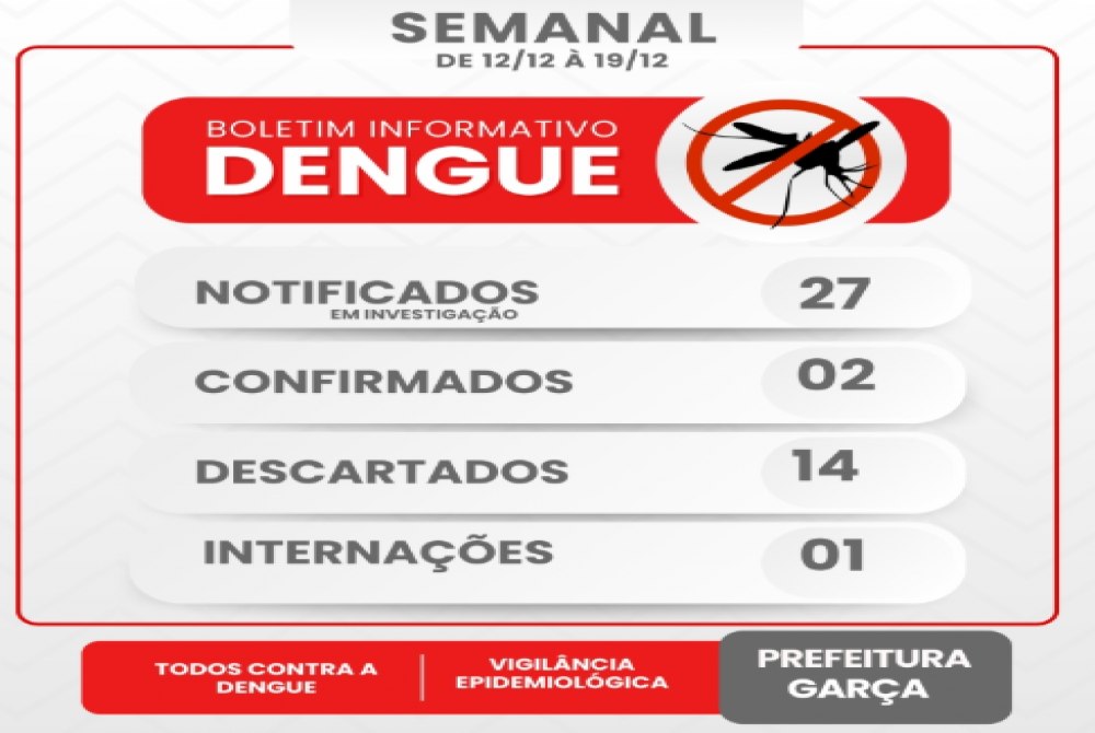 Na semana compreendida entre 12 e 19 de dezembro de 2025, foram notificados 27 casos em investigação. Entre eles, 2 foram confirmados e 14 descartados. Houve 1 paciente internado, não foram registrados óbitos em investigação, nem internações em leito clínico ou em UTI.
