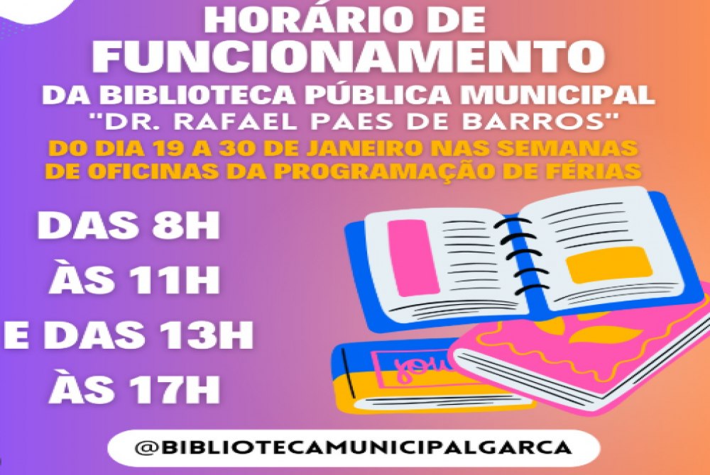 A diversão continua em janeiro! Estamos falando sobre a programação de férias da Biblioteca Municipal de Garça e o Centro Cultural de Jafa prepararam atividades especiais para crianças de todas as idades. Não é necessário inscrição prévia para as oficinas. Vamos ouvir a Bibliotecária Juliana Moretti Louzada, falando sobre a programação de férias do mês de Janeiro. A participação será por ordem de chegada com entrega de senhas. Como as vagas são limitadas, é necessário chegar com antecedência e a criança deve estar acompanhada por um adulto responsável durante as atividades. Os Jogos de Tabuleiro e Desenhos para Colorir: 08h às 11h e 13h às 17h. (Livre) a Brinquedoteca (Terça a Sexta): 08h às 10h30 e 13h30 às 16h30. (0 a 10 anos | 15 vagas por vez com permanência de 30 min). Horário da Biblioteca: Aberta de segunda a sexta, das 08h às 17h. OBS: de 19 a 30 de janeiro, o horário da biblioteca será das 8h às 11h e das 13h às 17h. Localizada na Av. Dr. Rafael Paes de Barros, 522, Labienópolis, Telefone: (14) 3471-1616.