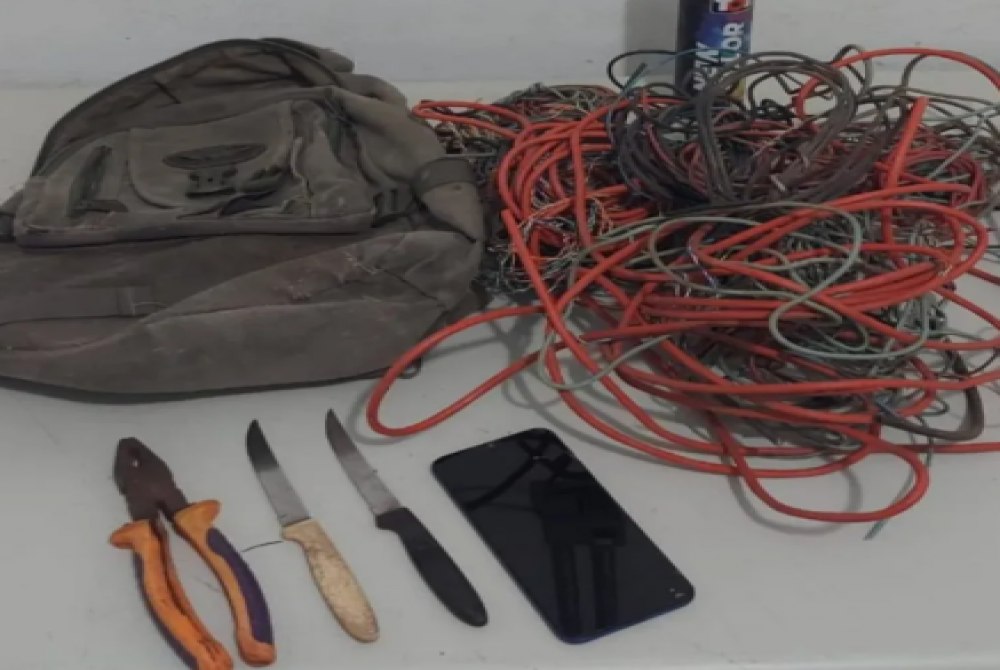 Com o indivíduo, foi encontrada uma mochila contendo diversos metros de fios de cobre já arrancados. A perícia constatou que a rede elétrica da residência foi severamente danificada, o que deve gerar um alto custo de reparo para o proprietário.