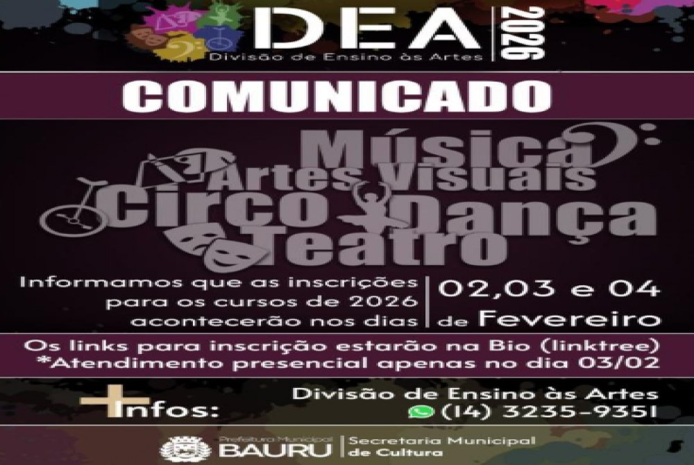 A Prefeitura de Bauru, por meio da Secretaria de Cultura, vai abrir novas vagas para os cursos oferecidos pela Coordenadoria de Políticas Públicas de Ensino às Artes – antiga Divisão de Ensino às Artes (DEA). Serão oferecidos cursos nas áreas de Artes Visuais, Circo, Dança, Música e Teatro, em diversas modalidades. Os interessados devem preencher os formulários, de acordo com o curso de interesse, que ficarão abertos nos dias 2, 3 e 4 de fevereiro, ou até encerrarem as vagas. Cada curso tem seu link específico, que poderão ser acessados em linktr.ee/dea_bauru. É importante ter atenção nos dias e horários dos cursos e nas idades permitidas para cada um deles. Menores de 18 anos devem ter os dados fornecidos por um representante legal. Os processos de seleção serão por avaliações de aptidão ou entrevistas com os interessados. Os horários dos cursos e das avaliações/entrevistas estão disponíveis nos formulários online. A data de divulgação dos aprovados será dia 20 de fevereiro. Para quem não dispõe de acesso à internet ou tem alguma dificuldade em preencher o formulário sozinho, a Secretaria de Cultura terá atendimento presencial no dia 3 de fevereiro, no prédio do Centro Cultural ‘Carlos Fernandes de Paiva’, na avenida Nações Unidas, 8-9 (o mesmo prédio do Teatro Municipal), no piso superior. O atendimento será das 8h30 às 16h30 e somente para estes casos. Não serão realizadas inscrições por telefone.