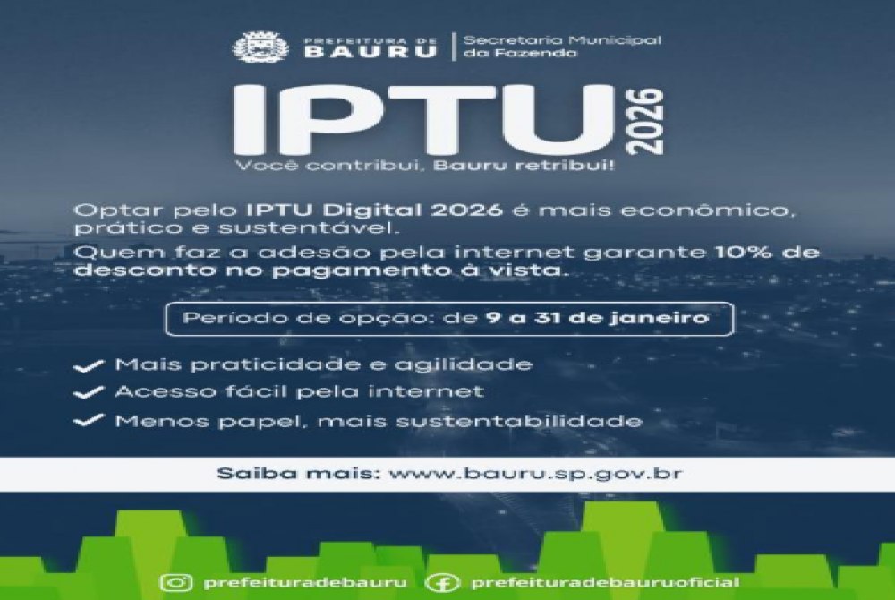 A Prefeitura de Bauru, por meio da Secretaria da Fazenda, informa que o prazo para realizar a opção pelo IPTU Digital segue até sábado (31). Para aderir, o contribuinte deve acessar neste período o link www.bauru.sp.gov.br/iptu, ícone acesso rápido – IPTU Digital. A opção também poderá ser feita pelo acesso com senha no Sistema Tributário, ambiente logado no qual todos os imóveis do contribuinte são apresentados. A alternativa permite que, no pagamento à vista, o desconto seja de 10%. Já aqueles que não optarem pelo IPTU Digital receberão o carnê em casa, com desconto de 5% no pagamento à vista. O vencimento, nas duas situações, será no dia 15 de abril. É importante ressaltar que ao realizar a opção pelo IPTU Digital será emitido um documento de comprovação de sua adesão. O pagamento parcelado, tanto para quem aderir ao IPTU Digital quanto para quem receber pelos Correios, não terá desconto. O parcelamento é permitido em quatro ou nove vezes, dependendo do valor. Cabe ressaltar que o período até sábado será exclusivamente para o contribuinte optar pelo não recebimento do carnê. Os boletos para pagamento ainda não estarão disponíveis neste período, o que deve ocorrer no mês de março, mesma época em que os carnês serão enviados para os endereços dos contribuintes. As datas para o pagamento à vista são as mesmas.