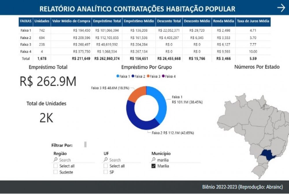 O mercado imobiliário de Marília apresentou transformações profundas e ritmo acelerado de crescimento na última meia década. Impulsionada principalmente pelos investimentos em habitação popular, a cidade consolidou-se como um polo regional do setor, com recordes sucessivos e capacidade de adaptação diante das oscilações econômicas nacionais, conforme apontam os relatórios da Associação Brasileira de Incorporadoras Imobiliárias (Abrainc). Entre 2020 e 2025, o desempenho do mercado refletiu tanto a expansão do crédito quanto a força da demanda local. Em 2020, primeiro ano da série histórica, Marília registrou 981 unidades contratadas e um volume total de financiamentos de R$ 112,4 milhões, patamar que serviu de base para a trajetória ascendente observada nos anos seguintes. Em 2021, o setor manteve ritmo positivo, com crescimento de 7,7% no valor financiado, que alcançou R$ 121,1 milhões, além de um aumento de 6,2% no número de unidades contratadas. A tendência de avanço moderado prosseguiu em 2022, quando o volume financeiro subiu mais 4,1%, totalizando R$ 126,1 milhões, sinalizando um mercado aquecido e em processo de maturação. Esse cenário preparou o terreno para o período mais expressivo da construção civil local. O biênio 2023-2024 marcou o auge do mercado imobiliário em Marília dentro do programa Minha Casa Minha Vida. Entre 2022 e 2023, o valor total de empréstimos mais que dobrou, saltando de R$ 126,1 milhões para R$ 262,9 milhões — um crescimento de 108,4% em apenas 12 meses. O avanço também se refletiu no número de contratos, que passou de cerca de mil para mais de 1,8 mil unidades. Em 2024, o desempenho foi ainda mais robusto. Marília atingiu o maior volume da série histórica, com 2.859 unidades contratadas e R$ 446,5 milhões em financiamentos. Os números mais recentes, referentes a 2025, indicam um movimento de acomodação após o pico histórico. O valor total de empréstimos recuou para R$ 262,9 milhões, queda de 41,1% em relação ao ano anterior. O número de unidades contratadas também diminuiu, chegando a 1.678.