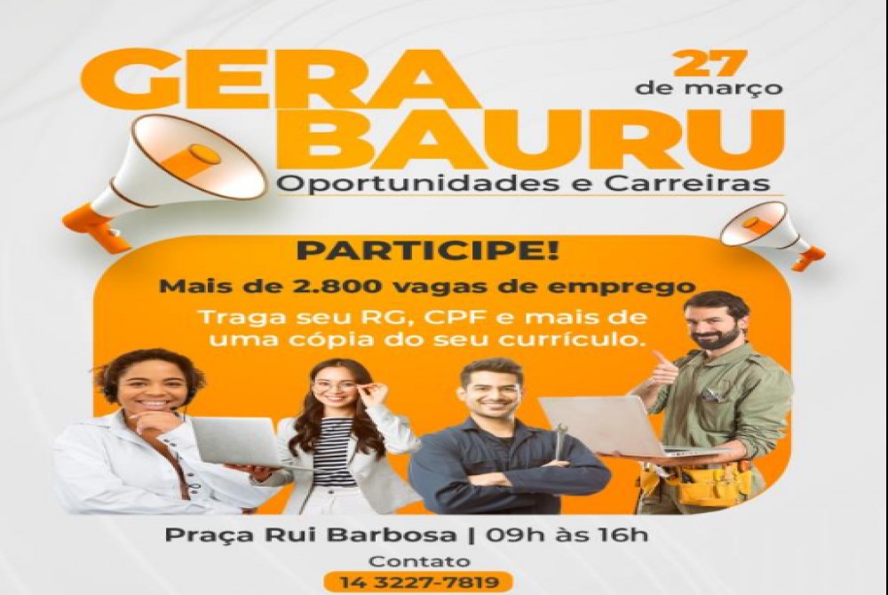 A Prefeitura de Bauru, por meio da Secretaria de Desenvolvimento Econômico, Turismo e Inovação (Sedecon), realiza a 9ª edição do ‘Gera Bauru – Oportunidades e Carreiras’, com o já tradicional mutirão de empregos. O evento será nesta sexta-feira (27), das 9h às 16h, na Praça Rui Barbosa, no Centro. Serão mais de 2.800 vagas de emprego, disponibilizadas por mais de 40 empresas de Bauru e região. Os candidatos devem levar RG, CPF e mais de uma cópia do currículo. O Gera Bauru permite que as pessoas interessadas encontrem o primeiro emprego ou uma recolocação no mercado de trabalho. As vagas são para todos os níveis de escolaridade, com oportunidades para pessoas com ensino fundamental, ensino médio, técnico e ensino superior, em diversas funções, além de vagas para pessoas com deficiência (PCD). As empresas são as responsáveis por fazer a seleção dos candidatos. Também serão disponibilizadas vagas de estágio para estudantes. Para outras informações, o telefone de contato é o (14) 3227-7819. A Sedecon fica na avenida Duque de Caxias, 16-55, com funcionamento das 8h às 17h de segunda a sexta-feira.